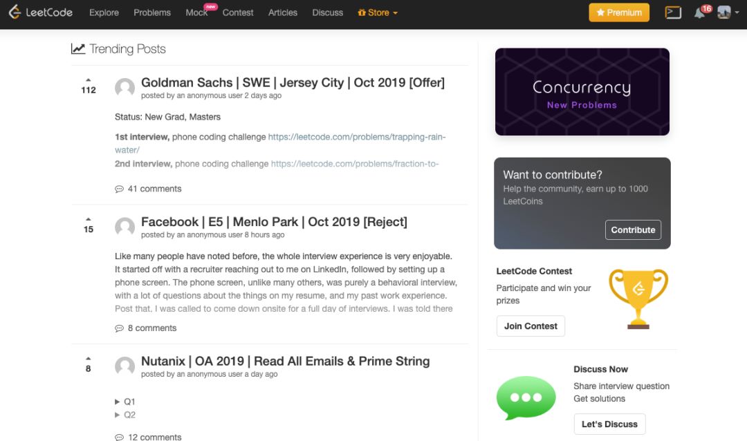 每道题目都有一个 Discuss 讨论模块,我们点击进去,会发现,这里贴满了前人发表的各种解决方案,排名靠前的,一般是最为优秀的,或是时间和空间复杂度消耗很低,或是代码实现优美,思路清晰易懂。
