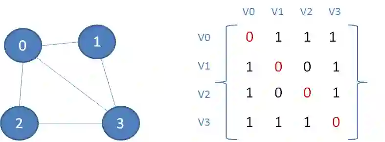 如图所示,顶点0和顶点1之间有边关联,那么矩阵中的元素A[0][1]与A[1][0]的值就是1;顶点1和顶点2之间没有边关联,那么矩阵中的元素A[1][2]与A[2][1]的值就是0。
