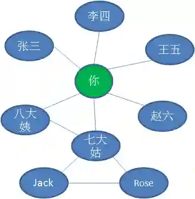 而你七大姑的微信号里,又有若干好友:你、八大姨、Jack、Rose。
