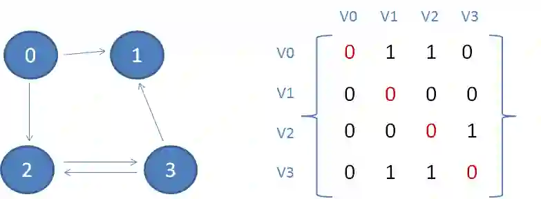 从图中可以看出,有向图不再是一个对称矩阵。从V0可以到达V1,从V1却未必能到达V0,因此A[0][1]和A[1][0]的值不一定相等。