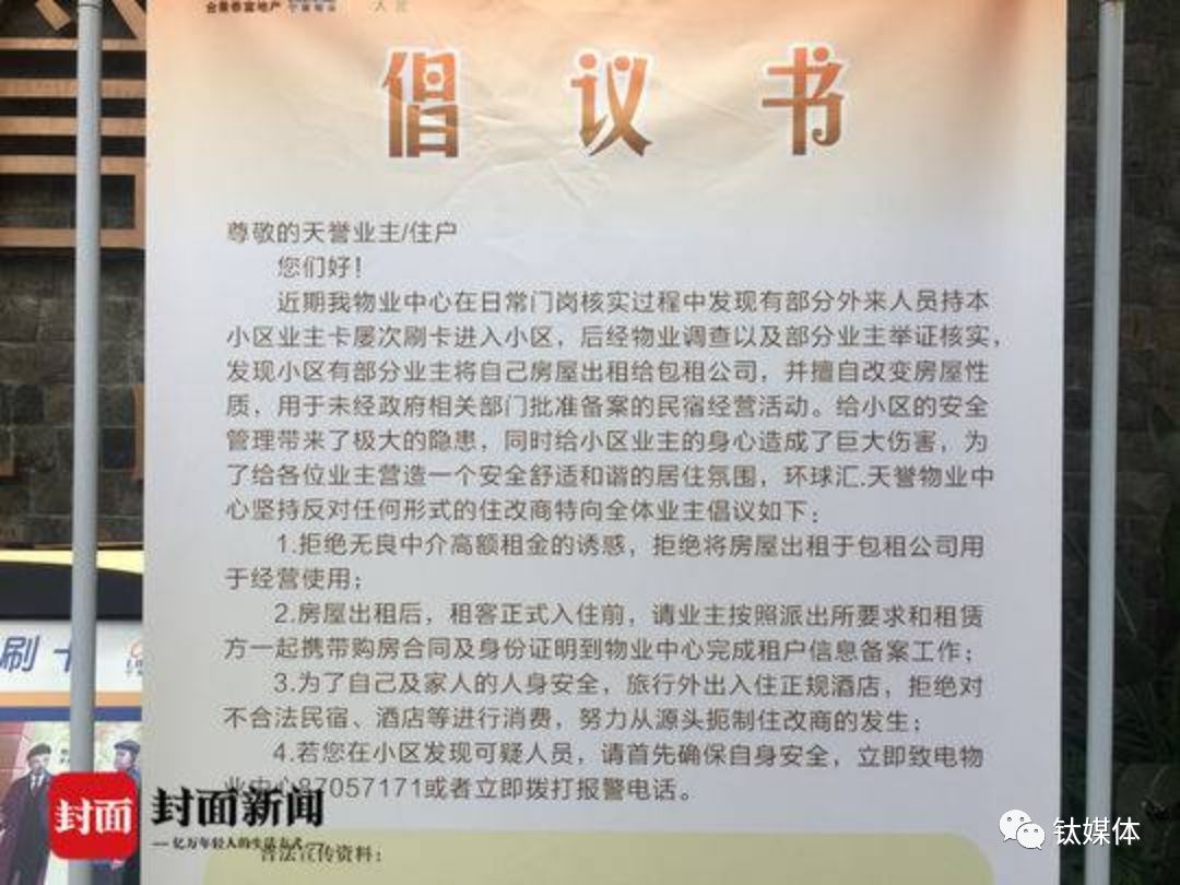 据当地媒体报道,这样“取缔”处罚在成都尚属首次。目前,已经有不少小区明确禁止民宿进入。