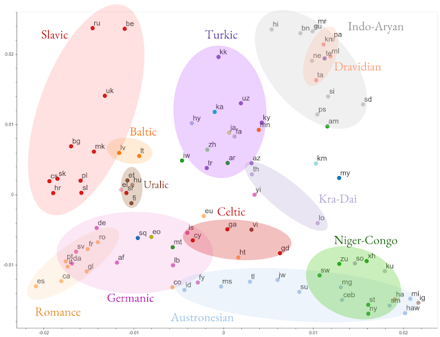 所有建模语言编码器表征归结并可视化呈现(基于表征相似性)。不同语言集群的编码表征(根据语言相似性)。我们按语系对语言进行颜色编码