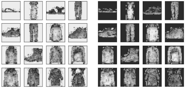 Fashion-MNIST 每个像素的对数似然图像(左)和对数似然比图像(右)。似然图像由“背景”像素主导,而似然比图像则侧重于“语义”像素,因此更适用于 OOD 检测