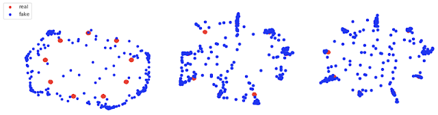 DGAN 集中加入的生成器越多,就越能覆盖真实分布中的多种模式。从左到右依次为:1 个生成器、5 个生成器和 10 个生成器
