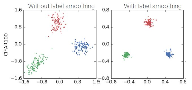 三个 CIFAR100 类的 2D 表征投影。在未经标签平滑处理时,示例分布较为分散;经过标签平滑处理后,每个示例与其他类的集群距离几乎相等,减弱了类内变异和类间相似的结构