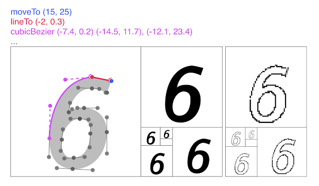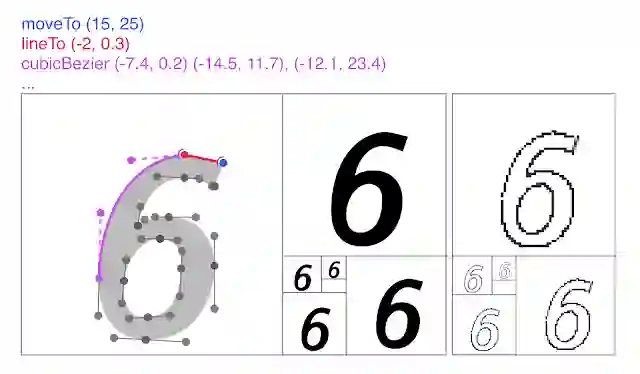 上图:与图标的像素表示(右)不同,本例中的“6” (SVG:左、中)是比例固定的表示。下图:通过直接创建 SVG 模型,我们可以帮助设计师快速、直观地进行排版设计