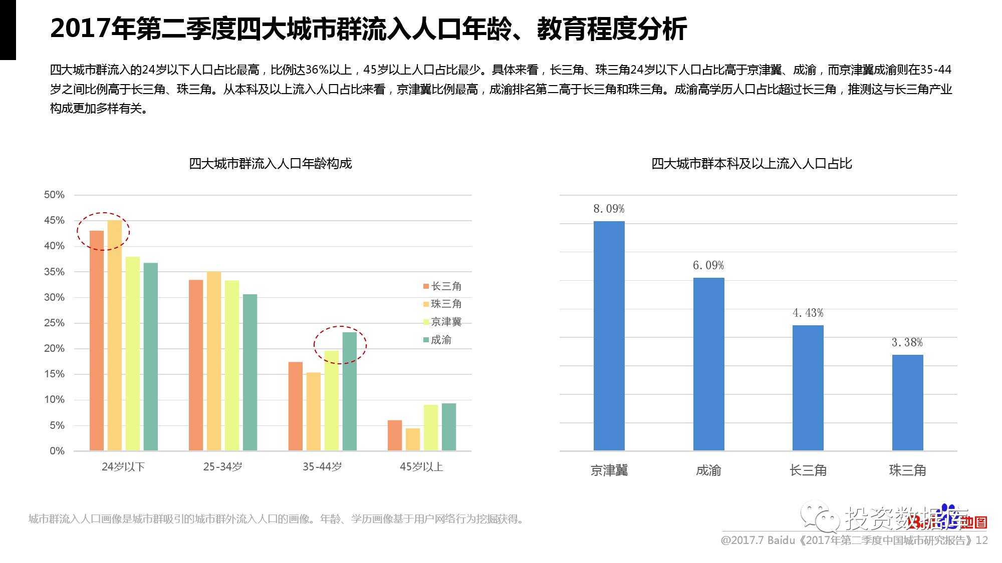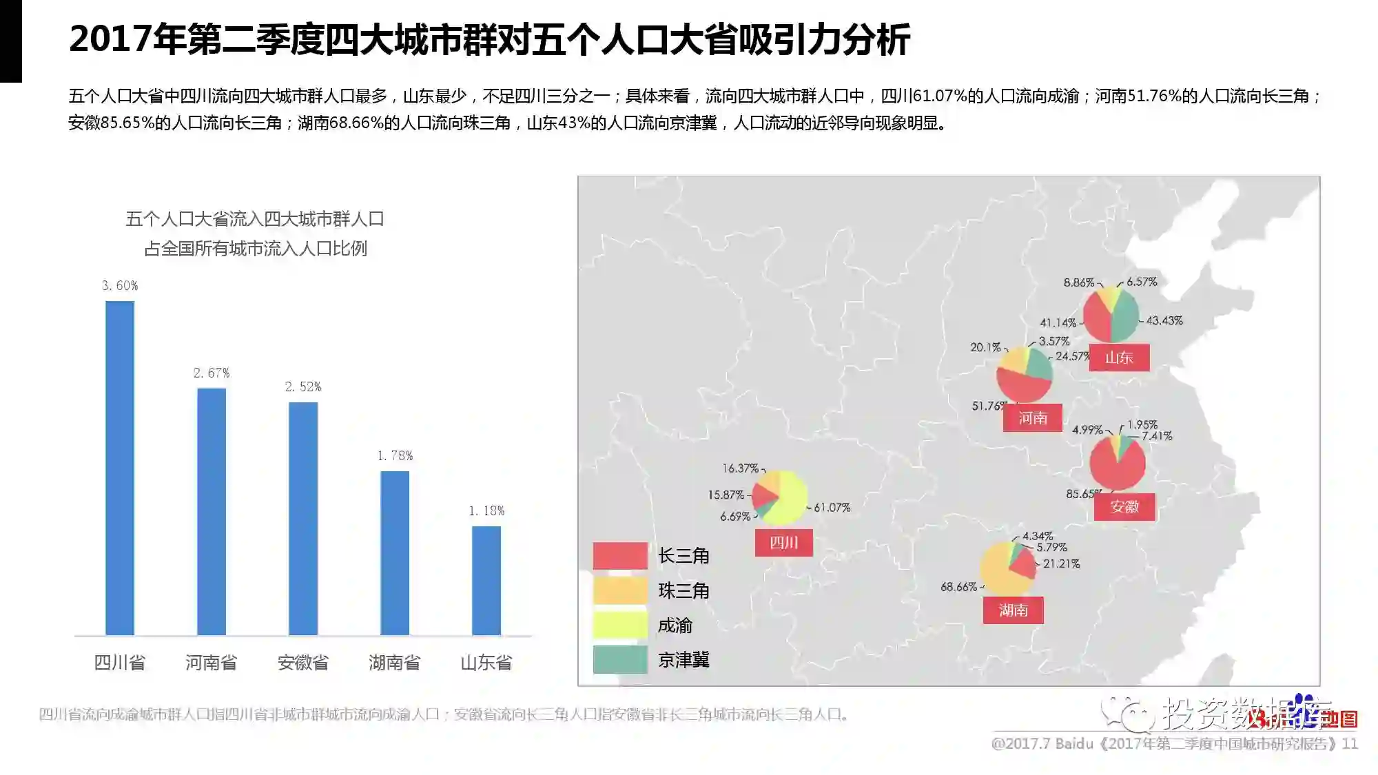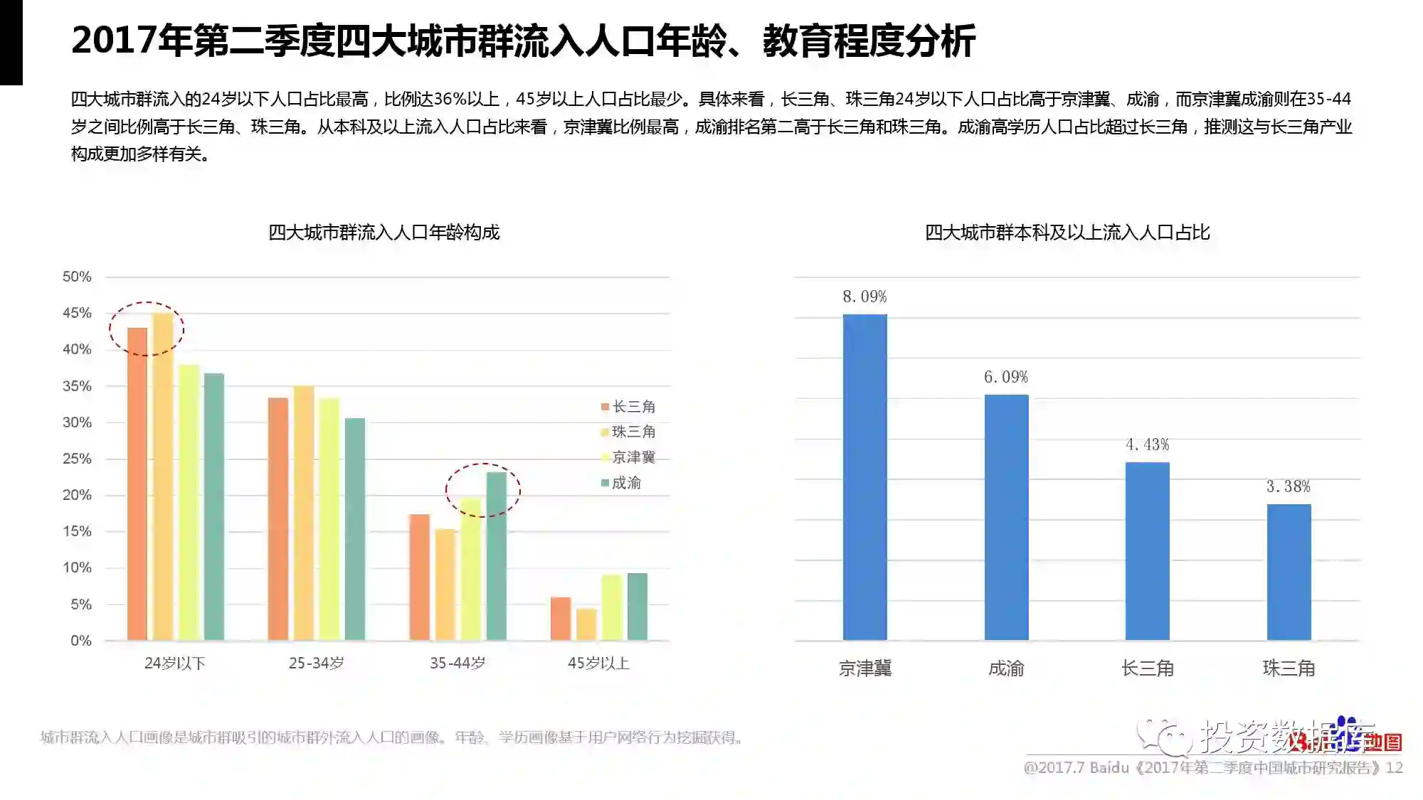 从流动人口来源和去向的综合分析上,四川、河南、安徽、湖南、山东这5个人口大省中,大家选择的目标城市也具有鲜明的地域特征,比如四川有61.07%的人口流向成渝、湖南68.66%的人口流向珠三角、安徽85.65%的人口流向长三角,虽然出门在外但仍希望离家近一点,成了中国人不约而同的选择。另外从年龄和教育程度的角度看,京津冀流入人口中年人更多但学历也更高,珠三角更年轻但平均学历也相对更低,地区产业结构与外来人才结构之间存在直接联系。