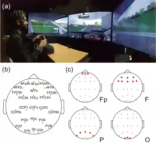 本研究的受试者为新加坡国立大学招募的 20 名健康学生。模拟驾驶环境主要包括模拟驾驶系统和无线式脑电图采集系统两部分,如图 1(a) 所示。在无声驾驶的情况下,每个实验持续时间为一个半小时。