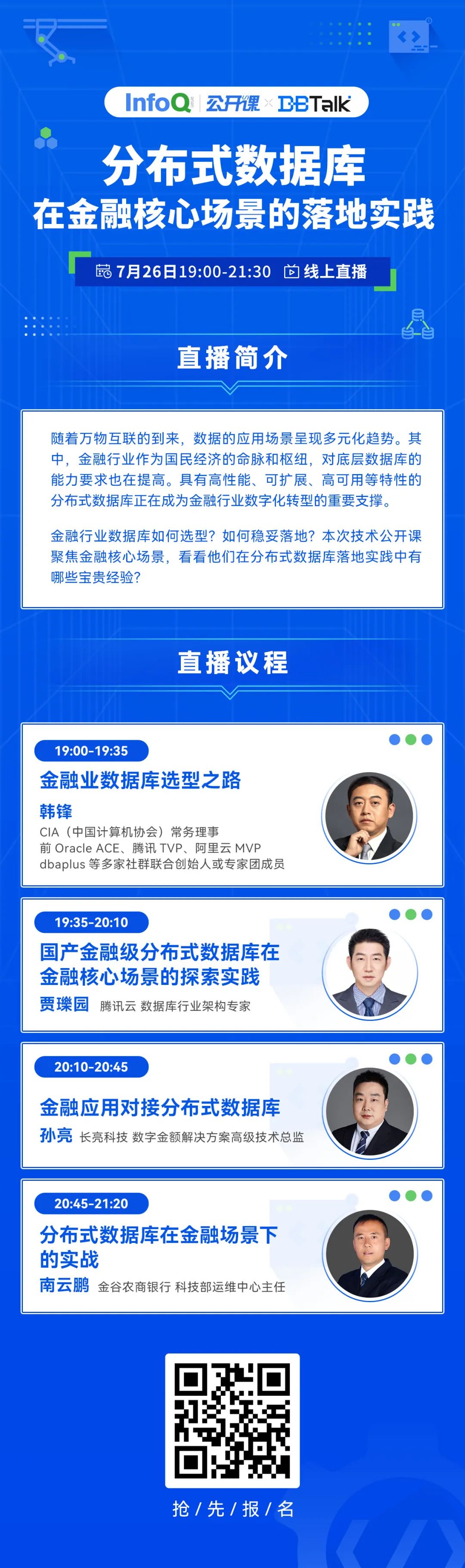 7 月 26 日 19:00-21:30,我们邀请了 4 位嘉宾,带来 4 场精彩的线上主题分享,解答大家关于金融行业分布式数据库选型、落地实践等实际问题。