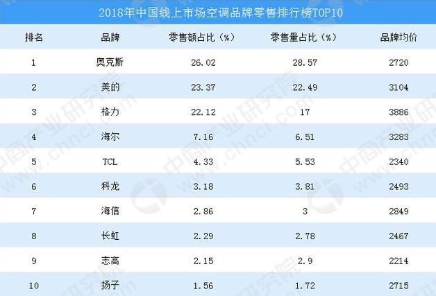 2018年的京东双11促销中,奥克斯力压美的、格力位居首位。而在2018年线上空调销售排行榜上,奥克斯同样位居第一,均价相比格力低三成左右。