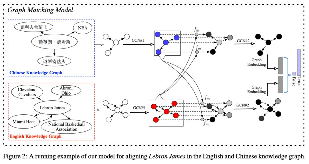 将知识图谱中实体对齐问题转化为图匹配问题。进一步提出了一种基于图注意的解决方案,该方案首先匹配两个主题实体图中的所有实体,然后对局部匹配信息进行联合建模,得到图级匹配向量。