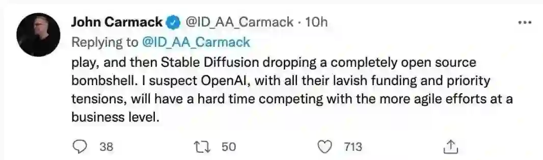 业界普遍认为,Stability AI的迅速崛起给OpenAI造成了不小压力,John Carmack(AGI初创公司Keen Technologies创始人,前Oculus CTO)表示