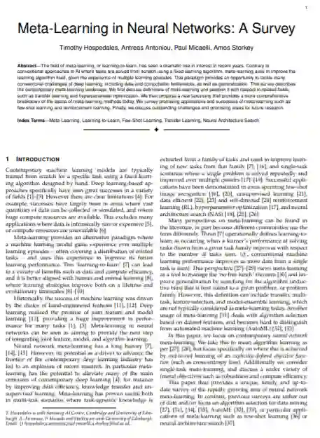 元学习提供了另一种范式,机器学习模型可以在多个学习阶段获得经验——通常覆盖相关任务的分布——并使用这些经验来改进未来的学习性能。这种“学会学习”[8]可以带来各种好处,如数据和计算效率,它更适合人类和动物的学习[9],其中学习策略在一生和进化时间尺度上都得到改善[10,9,11]。机器学习在历史上是建立在手工设计的特征上的模型,而特征的选择往往是最终模型性能的决定因素[12,13,14]。深度学习实现了联合特征和模型学习的承诺[15,16],为许多任务提供了巨大的性能改进[1,3]。神经网络中的元学习可以看作是集成联合特征、模型和算法学习的下一步。神经网络元学习有着悠久的历史[17,18,8]。然而,它作为推动当代深度学习行业前沿的潜力,导致了最近研究的爆炸性增长。特别是,元学习有可能缓解当代深度学习[4]的许多主要批评,例如,通过提供更好的数据效率,利用先验知识转移,以及支持无监督和自主学习。成功的应用领域包括:小样本图像识别[19,20]、无监督学习[21]、数据高效[22,23]、自导向[24]强化学习(RL)、超参数优化[25]和神经结构搜索(NAS)[26, 27, 28]。
