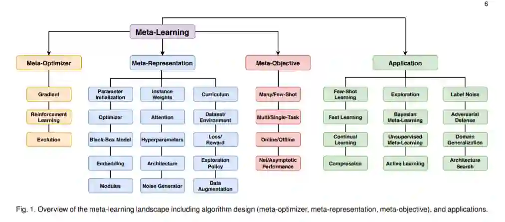 在文献中可以找到许多关于元学习的不同观点。特别是由于不同的社区对这个术语的使用略有不同,所以很难定义它。与我们[29]相关的观点认为,元学习是管理“没有免费午餐”定理[30]的工具,并通过搜索最适合给定问题或问题族的算法(归纳偏差)来改进泛化。然而,从广义上来说,这个定义可以包括迁移、多任务、特征选择和模型集成学习,这些在今天通常不被认为是元学习。另一个关于元学习[31]的观点广泛地涵盖了基于数据集特性的算法选择和配置技术,并且很难与自动机器学习(AutoML)[32]区分开来。在这篇论文中,我们关注当代的神经网络元学习。我们将其理解为算法或归纳偏差搜索,但重点是通过端到端学习明确定义的目标函数(如交叉熵损失、准确性或速度)来实现的。