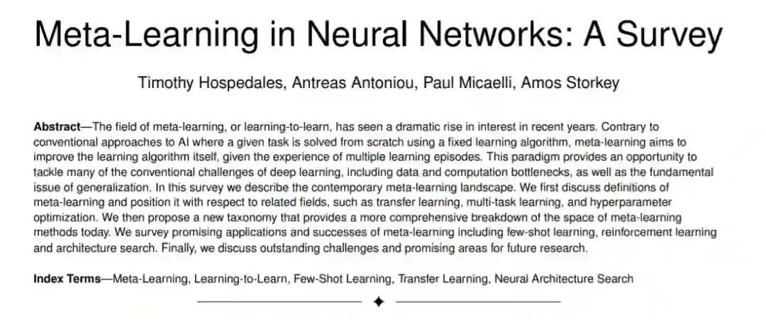 因此,本文提供了一个独特的,及时的,最新的调查神经网络元学习领域的快速增长。相比之下,在这个快速发展的领域,以往的研究已经相当过时,或者关注于数据挖掘[29、33、34、35、36、37、31]、自动[32]的算法选择,或者元学习的特定应用,如小样本学习[38]或神经架构搜索[39]。