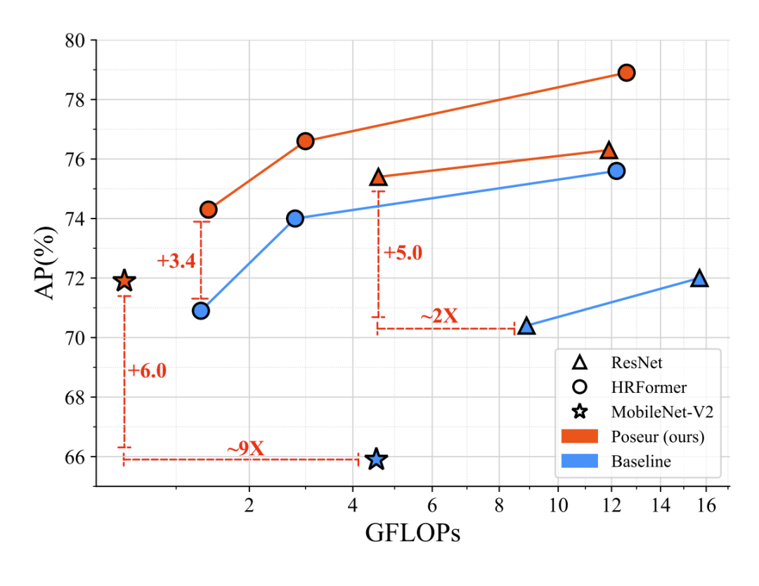 首先从论文标题也可以看到,Poseur是属于Regression-based方法。我认为这篇工作最大的亮点在于,它在Regression方法和Transformer的结合上进行了细致的设计,最终在COCO val上刷到了AP79.6,test-dev上AP78.3,相较于之前的SOTA如HRFormer的77.8/76.2,和我介绍过的ViTPose取得的79.8/78.4已经完全不遑多让了。作为一种Regression-based方法,Poseur在计算量和运算速度上有着显著的优势,并且能用MobileNetv2作为backbone取得媲美ResNet50+SimpleBaseline的效果。