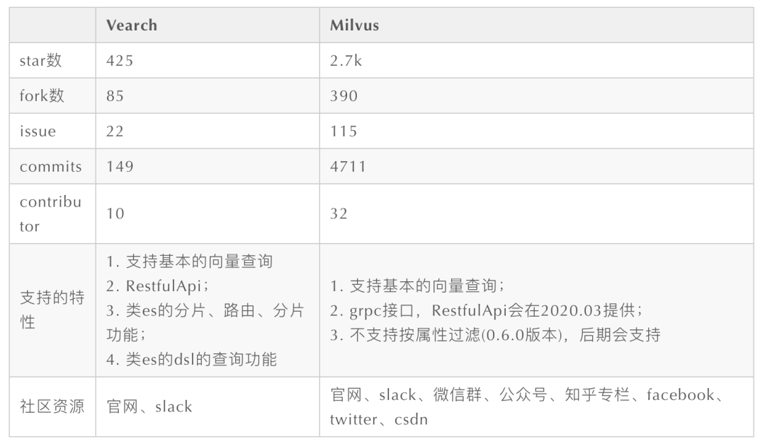 Vearch和Milvus属于同类型产品,对比faiss和SPTAG的优势在于,后两者为开发库,不能开箱即用,在生产环境中使用涉及更多的开发、维护成本。Milvus和Vearch是两款基于现有的开发库,开箱即用的应用,在实现基本的相似计算功能的基础上,围绕服务整体易用性、部署、稳定性等方面做了更多工作。另外,Milvus对比Vearch,在社区活跃度、支持度上具有更明显的优势。基于以上的调研,综合考虑各方面的成本,我们选择Milvus作为底层引擎。