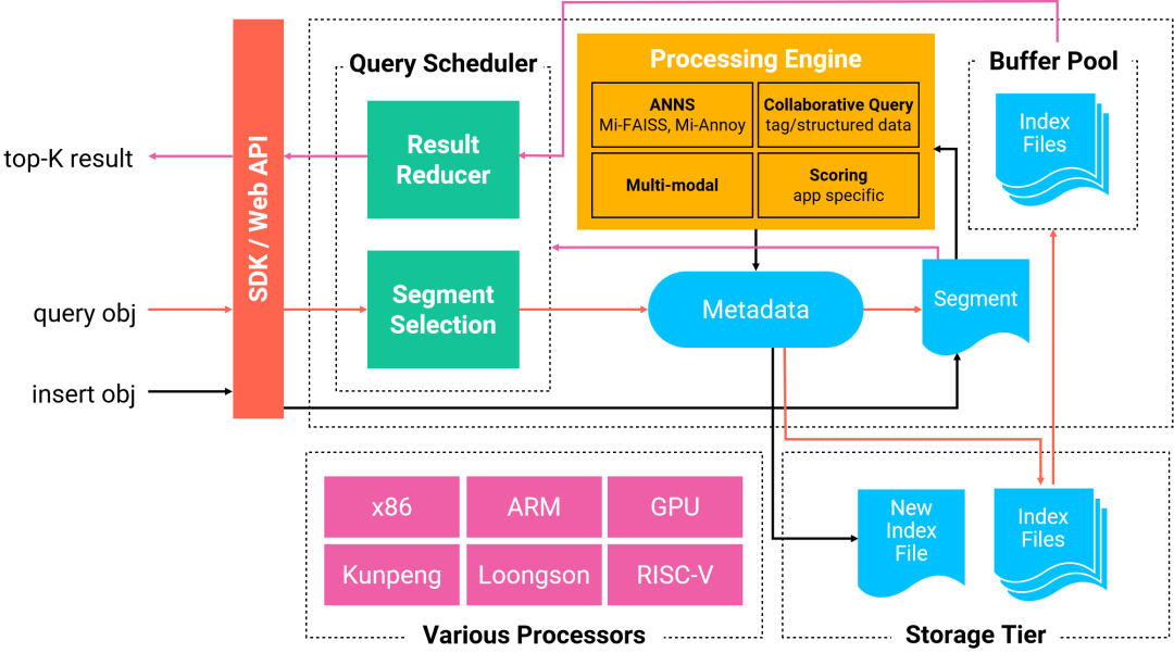 如图1所示,Milvus基于Faiss、Annoy等比较成熟的开源库,并针对性做了定制,支持结构化查询、多模查询等业界比较急需的功能;Milvus支持cpu、gpu、arm等多种类型的处理器;同时使用mysql存储元数据,并且在共享存储的支持下,Milvus可以支持分布式部署。