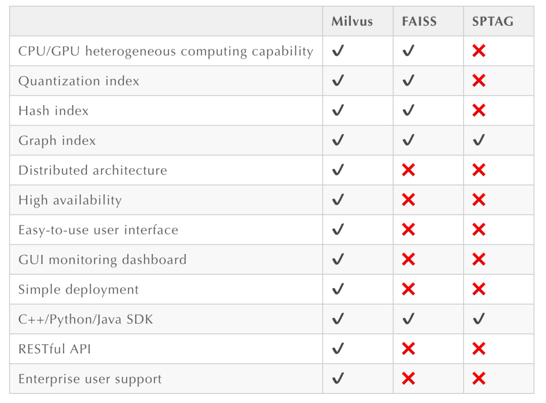 在技术选型阶段,我们调研了业界已经比较成熟的工具,如facebook的faiss[5]、微软的SPTAG[8],以及国内发起的开源项目Vearch[13],Milvus[1]。具体对比见表1,2。