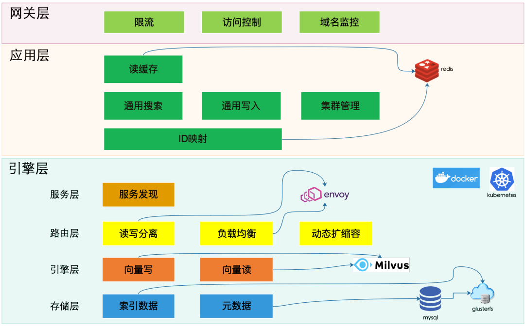 引擎层:引擎层基于docker+kubernetes,实现了Milvus引擎的部署、服务发现、数据存储以及资源的管理。