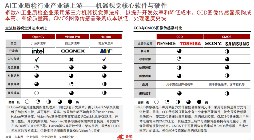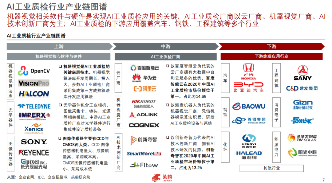 机器视觉为各行业集成应用和服务,其中包括了基于机器视觉发展的AI工业质检行业。AI工业质检技术作为机器视觉的应用层,其主要运用了机器视觉的算法库、光学器件以及图像传感器。AI工业质检已成为机器视觉在制造业的重要应用之一,推动中国制造业的智能化发展