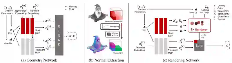 首先,(a)网络获取的是物体的几何形状,这是与NeRF最相似的部分,文中称为几何网络(Geometry Network)。它将输入图像、分割遮罩和相机参数估计结合起来建立一个辐射场,并找到每个像素的密度和颜色的猜测结果,整体流程和NeRF基本相同,但新模型需要适应输入图像中不同的照明条件。