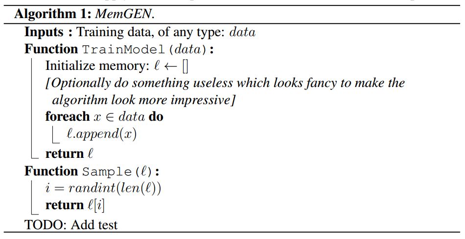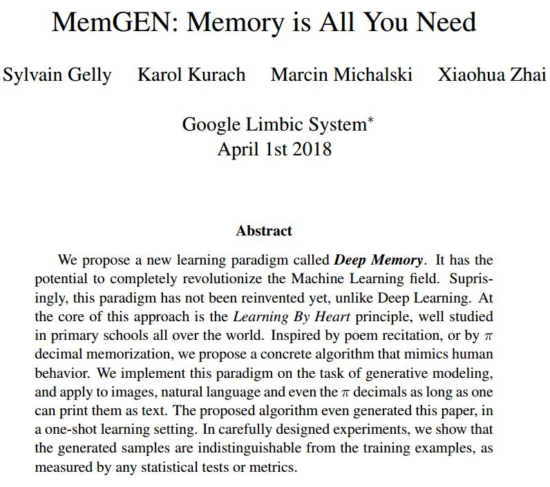 最近,我们提出了一种新型的学习范式,我们将其称之为Deep Memory。它有可能彻底革新机器学习领域。令人惊奇的是,与深度学习不同,这种范式还没有被重新加以改造。这种方法的核心是“Learning By Heart”原则,而这一原则在全世界的小学中得到了充分研究。受到诗歌朗诵或π小数记忆的启发,我们提出了一种模仿人类行为的具体算法。我们在生成式建模任务上实现了这个范式,并将其应用于图像、自然语言,甚至π小数,只要人们能够将它们打印成文本。我们所提出的算法甚至在独热学习环境中生成了本篇论文。通过精心设计的实验,我们表明,通过任何统计测试或度量进行衡量,所生成的样本都无法与训练样本相区分。