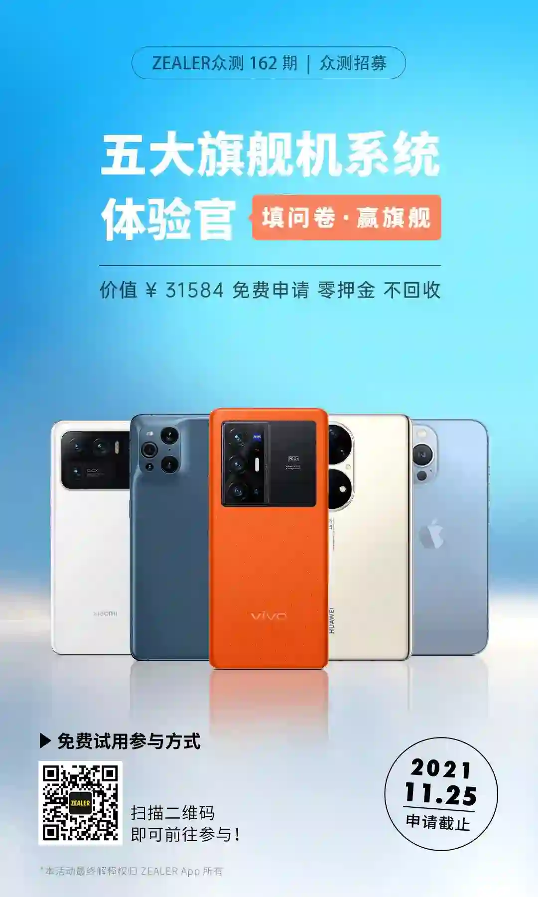 只需扫描上图二维码或点击下方阅读原文参与众测活动填写问卷,按照自己情况真实填写,即可申领以上 5 款旗舰新机,0 押金!不回收!快来 ZEALER App 抢先获取!