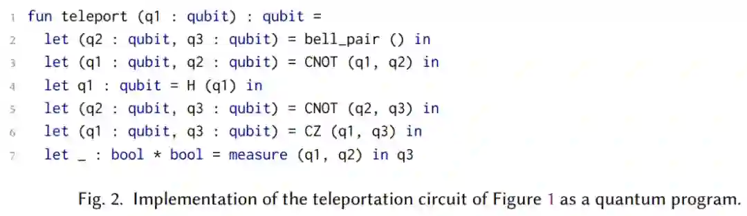下图 2 展示了图 1 中量子电路的程序,它作为一个函数接受量子比特 q^1 并返回传送的输出,其中助手(helper)bell_pair 分配了一个贝尔对(Bell pair)。