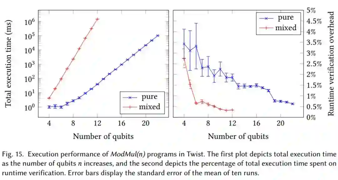 最后,研究者对 Twist 的类型系统进行评估,并在模拟中分析了一组基准量子程序,证明了 Twist 可以表达量子算法,捕捉编程错误,并支持现有量子编程语言不支持的程序,同时产生的运行时验证开销低于 3.5%