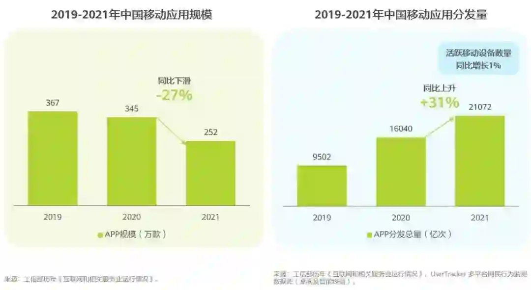 近两年无论是中国智能手机市场,还是整体移动应用数量皆出现持续下滑,白皮书数据显示,2021年国内应用数量下降幅度更是高达27%。同时,移动应用分发量同比提升幅度为31%,疫情持续推动用户对在线移动应用服务的需求快速增长。