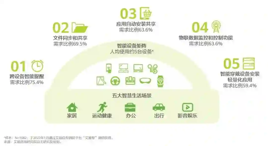 在智能硬件层面,智能硬件矩阵不断丰富,伴随着智能设备不断深入各大生活场景,用户对跨设备的智能互联有了新的要求,白皮书调研数据显示,智能提醒、文件同步、应用共享、物联数据打通以及在智能穿戴设备上安装轻量化应用等用户需求在60%及以上。