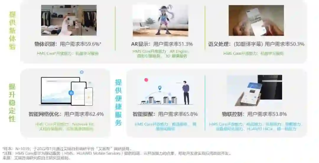 以AI技术为例,白皮书数据显示,AI技术为应用提供如物体识别、AR显示、语义处理等新体验,相关功能的用户需求比例在50%-60%。而在智能提醒、物联控制等便捷服务中,智能提醒以超过65%的用户选择率高居所有服务榜首。