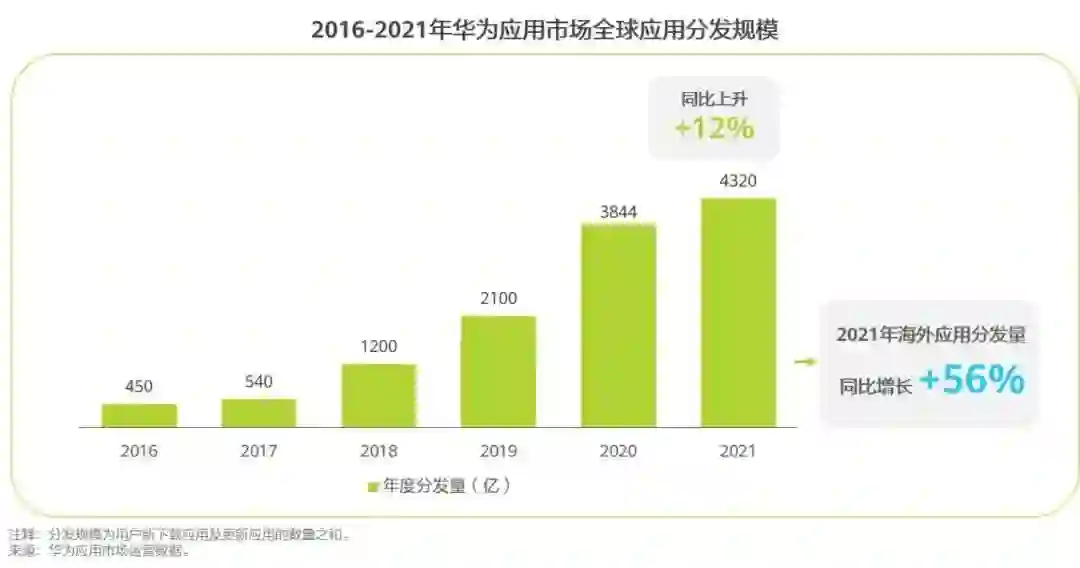 另一个值得关注的是,移动应用出海趋势明显。从华为应用市场数据来看,2021年华为应用市场全球应用分发规模已达到4320亿次,同比增长12%,海外应用分发量同比增长56%。海外分发增长明显,一方面源于华为应用市场对国内优质应用出海的助力,另一方面也源于华为应用市场与开发者在海外进行的深度合作和本地化运营支持。