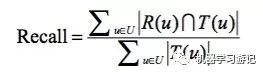 评分预测只能适用于小部分的场景,比如对于电影,书籍的评分,其实Top-N推荐更加符合现在的需求,给用户提供一个推荐的列表让其进行选择。Top-N推荐一般通过准确率与召回率来进行衡量。其中令R(u)是根据用户在训练集上的行为给用户作出的推荐列表(指的是预测的推荐列表),而T(u)是用户在测试集上的行为列表(指的是真实的列表GroundTruth),在这笔者总是容易混淆两者的含义。