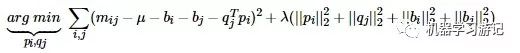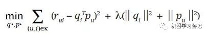 借鉴线性回归的思想,通过最小化观察数据的平方来寻求最优的用户和项目的隐含向量表示。同时为了避免过度拟合(Overfitting)观测数据,又提出了带有L2正则项的FunkSVD,上公式: