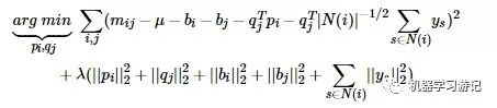 它是基于这样的假设:用户对于项目的历史评分记录或者浏览记录可以从侧面反映用户的偏好,比如用户对某个项目进行了评分,可以从侧面反映他对于这个项目感兴趣,同时这样的行为事实也蕴含一定的信息。其中N(i)为用户i所产生行为的物品集合;ys为隐藏的对于项目j的个人喜好偏置,是一个我们所要学习的参数;至于|N(i)|的负二分之一次方是一个经验公式。
