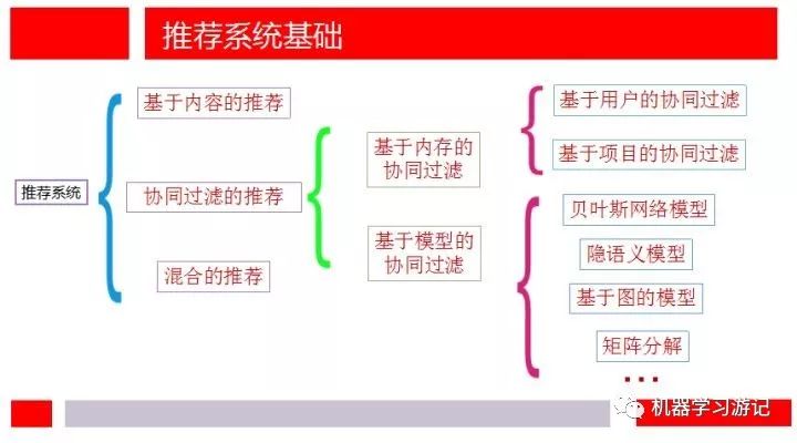 说到推荐系统的分类,我还是想从简单的方式开始,对于一些新颖的推荐系统方法,之后再介绍。根据推荐算法所用数据的不同分为基于内容的推荐、协同过滤的推荐以及混合的推荐。在这放一张第一次组会时的ppt: