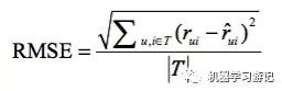 预测特定用户对于没有产生过行为的物品能够打多少分。评分预测一般通过均方根误差(RMSE)和平均绝对误差(MAE)来计算。对于测试集中的用户u和项目i,rui是用户u对项目i的真实评分,r^ui是推荐算法预测出的评分,那么RMSE: