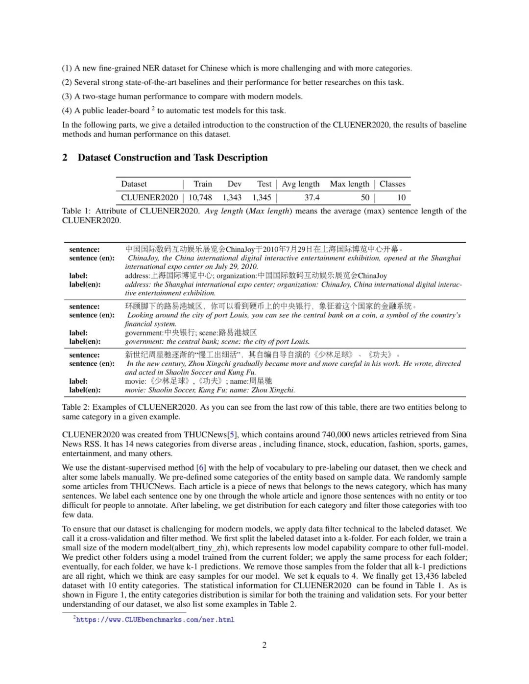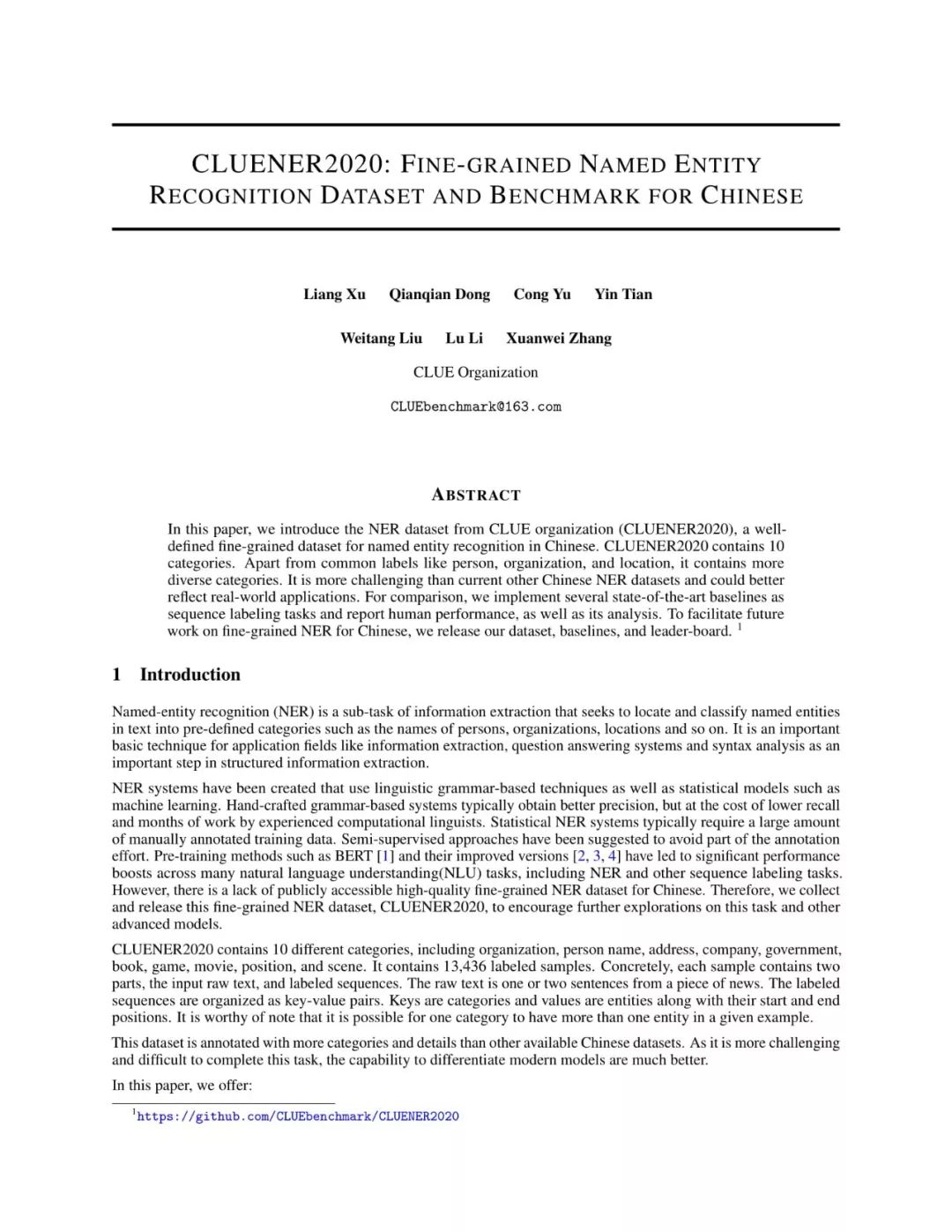 目前可公开访问获得的、高质量、细粒度的中文NER数据集较少,我们(CLUE)基于清华大学开源的文本分类数据集THUCNEWS,选出部分数据进行细粒度命名实体标注,并对数据进行清洗,得到一个细粒度的NER数据集。