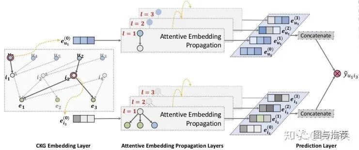 下图3是KGAT模型的框图,模型有三部分组成:CKG Embedding Layer、Attentive Embedding Propagation Layers、Prediction Layer。