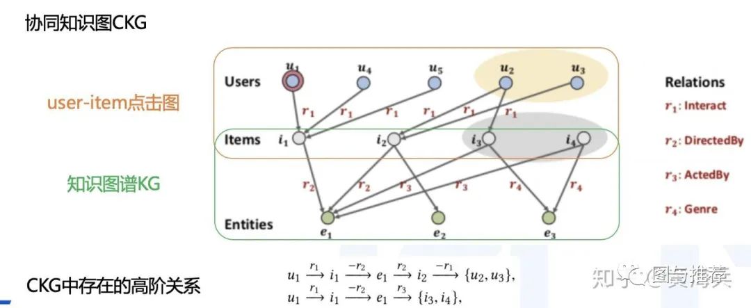 比如下图2中,用户u1看了电影 i1,这个电影是e1导演的,传统的CF方法会着重去找那些也看了电影i1的用户,比如u4跟u5。而监督学习方法会重点关注那些有相同属性e1的电影,比如i2。很显然这两类信息都可以作为推荐信息的补充,但是现有的模型不能做到上面两者信息的融合,而且这里的高阶关系也可以作为推荐信息的补充的。比如图中黄色框图里的用户看了同样由e1导演的电影i2, 还有灰色框图里电影同样也有e1的参与。