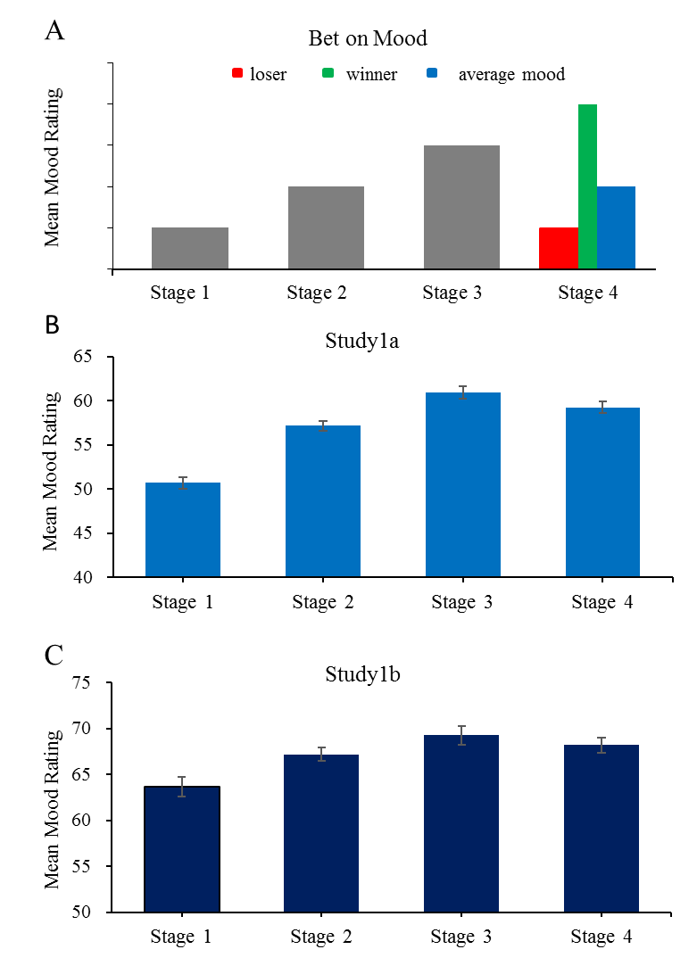 结果表明:在购买彩票后(阶段2)的心境水平显著上升,并在受测者核对中奖号码前(阶段3)达到峰值。在问卷星网站采集到的1,931名受测者的结果与中彩网上的彩民受测者在不同阶段的心境基本一致。