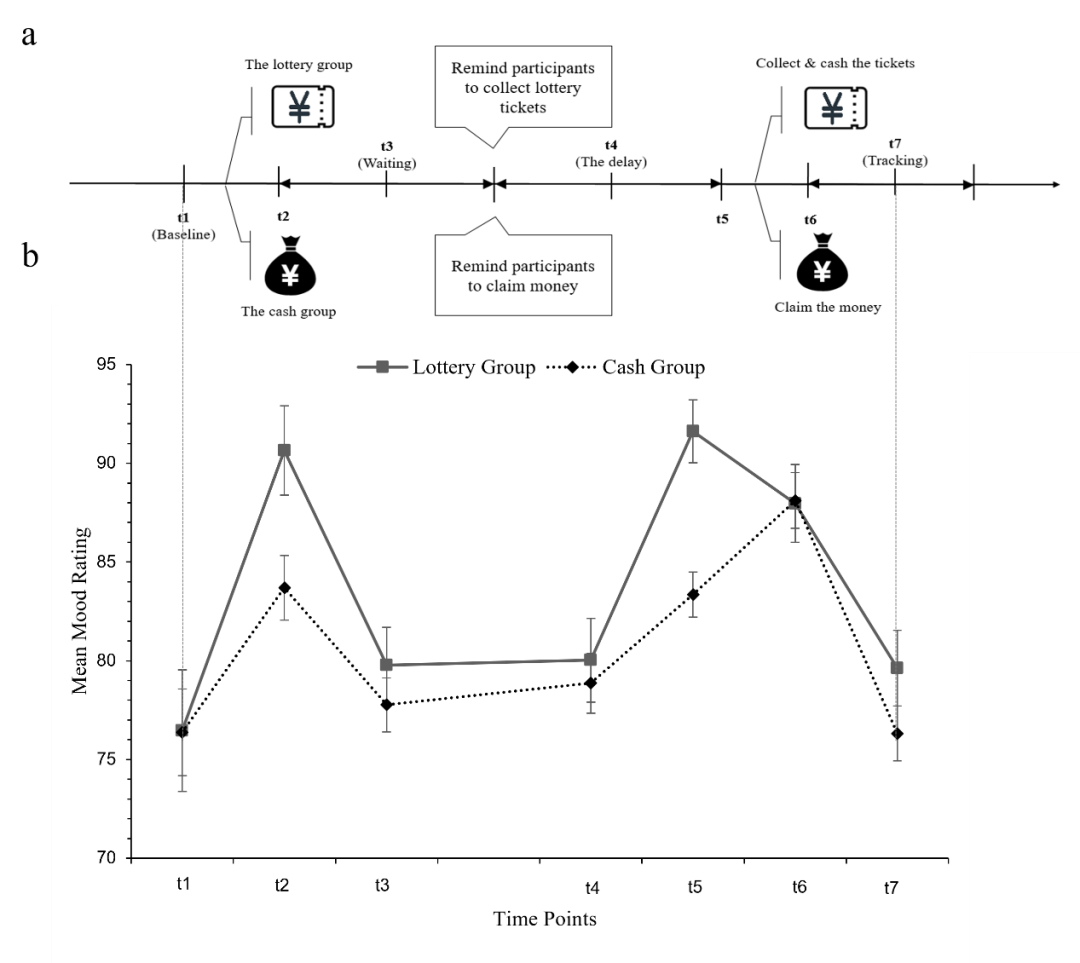 同时,我们在实验室中设计了一个完整的单次购彩过程,并将其划分为七个时间点。通过测量受试者在各时间点的心境,我们检验了彩票是否可以提供金钱刺激之上额外的心境助益,并比较了现金组和彩票组领奖的延迟时长和弃奖人数。