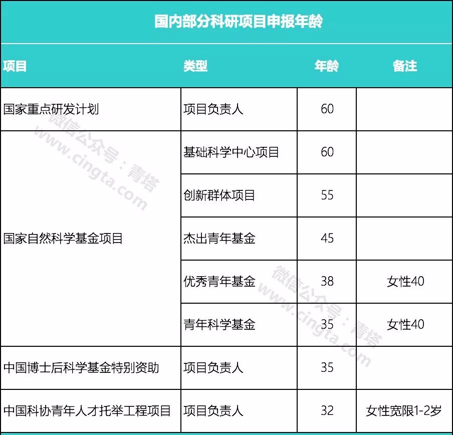 比如,国家重点研发计划项目负责人限制在60岁,国家自然科学基金基础科学中心项目负责人限制在60岁,国家杰青限制在45岁,创新群体项目限制在55岁,优秀青年基金限制在38岁(女性40岁),中国博士后科学基金35岁……