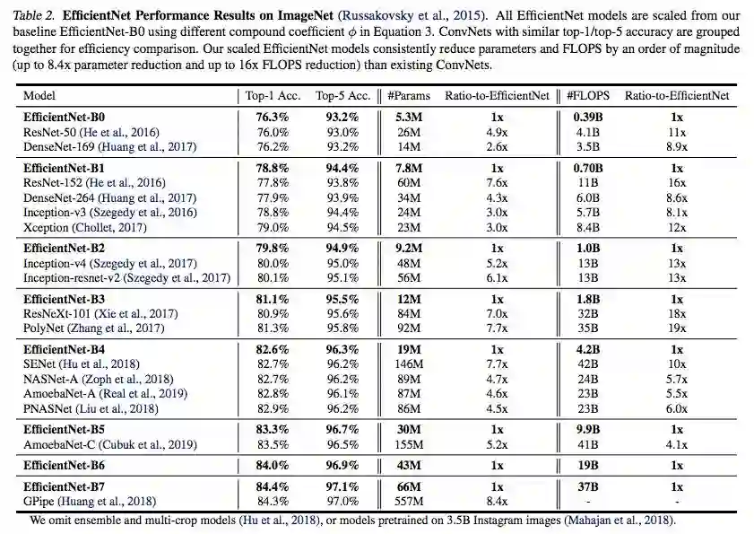 研究人员在 ImageNet 数据集上对比了 EfficientNets 和已有 CNN 模型。EfficientNet 模型要比已有 CNN 模型准确率更高、效率更高,其参数量和 FLOPS 都下降了一个数量级。例如,在高准确率的模式中,EfficientNet-B7 在 ImageNet 上获得了当前最优的 84.4% top-1 / 97.1% top-5 准确率,CPU 推断速度是 Gpipe 的 6.1 倍,而后者的大小是 EfficientNet-B7 的 8.4 倍。与现在广泛使用的 ResNet-50 相比,EfficientNet-B4 使用类似的 FLOPS 取得的 top-1 准确率比 ResNet-50 高出 6.3%(ResNet-50 76.3%,EfficientNet-B4 82.6%)。