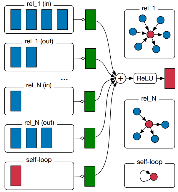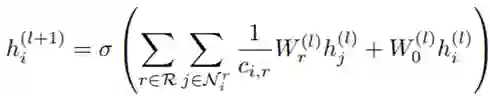 由于知识图谱是一个多关系图数据,因此,RGCN 在使用 GCN 的过程中针对一个实体邻域中的不同关系分别进行聚合操作,encoder 部分中每一层的 GCN 的设计为: