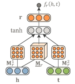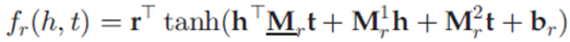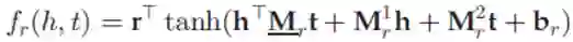 可以看出,NTN 的整个网络结构包括针对头实体和尾实体的线性映射和双线性映射,激活函数和关系 r 的显式参数表示。NTN 的打分函数为: