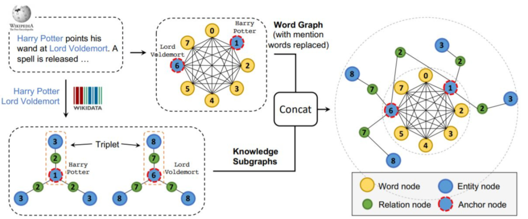 具体地,CoLAKE 首先将输入文本中的所以单词节点形成全连接 word graph,接着把文本中表示实体的单词节点替换为对应的实体节点(这类实体节点被称为anchor node),然后获取该实体在知识图谱中子图(knowledge subgraph)并将子图与 word graph 进行拼接组成 word-knowledge graph,具体构建过程如下图。