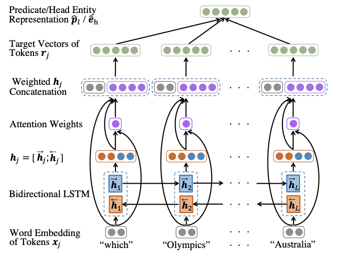 ,利用知识图谱表示学习进一步解决了多跳的 KBQA 任务。文章首先使用知识图谱表示学习模型 ComplEx 预训练知识图谱中实体和关系的嵌入表示。